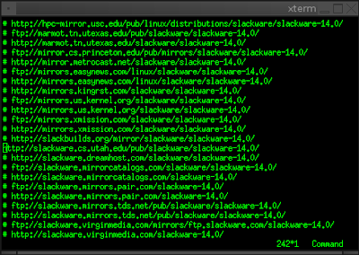 Lo primero que debemos hacer es editar el archivo /etc/slackpkg/mirrors, quitando el comentario de uno de los repositorios a usar, en mi caso quiero utilizar uno de USA así que quite el comentario de la siguiente linea.