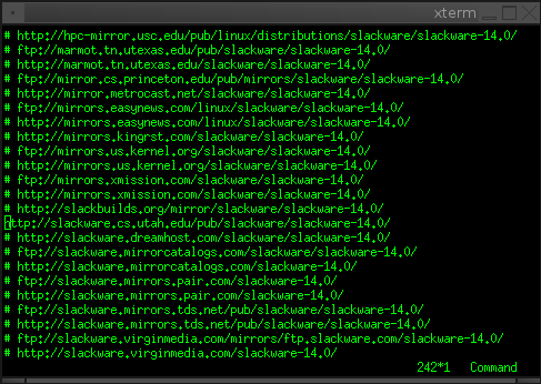 Lo primero que debemos hacer es editar el archivo /etc/slackpkg/mirrors, quitando el comentario de uno de los repositorios a usar, en mi caso quiero utilizar uno de USA así que quite el comentario de la siguiente linea.